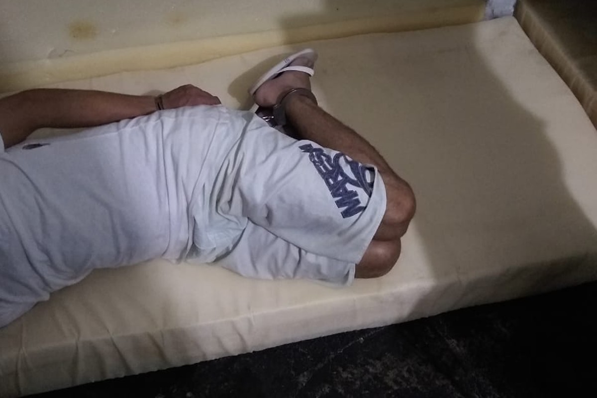Foto enviada em grupo de agentes mostra detento jogado no chão, com braços algemados entre as pernas
