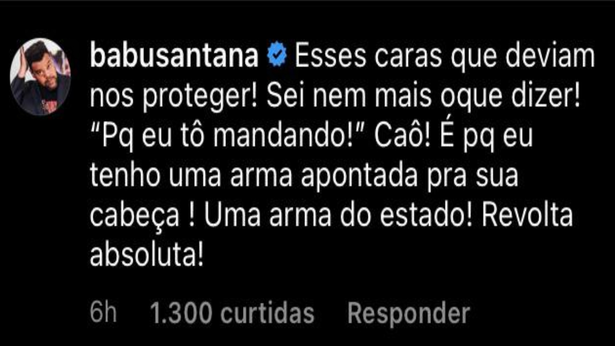 Já o ator Babu Santana, conhecido pela luta ao combate ao Racismo, deixou sua opinião ao comentar uma publicação feita no Instagram do deputado federal pelo Psol do Rio de Janeiro, David Miranda. “Esses caras que deviam nos proteger! Sei nem mais o que dizer! ‘pq eu tô mandando!’ Caô, é porque eu tenho uma arma apontada pra sua cabeça”, defendeu Babu.