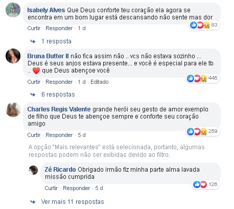 A vida difícil, o esforço de ambos e a notícia da morte da mulher, com a publicação, não demoraram para repercutir na internet. Apesar de ter enfrentado velório e enterro sem o apoio de amigos e familiares, Zé recebeu, na plataforma digital, mensagens de conforto, principalmente, de desconhecidos. Veja algumas delas na imagem abaixo:
