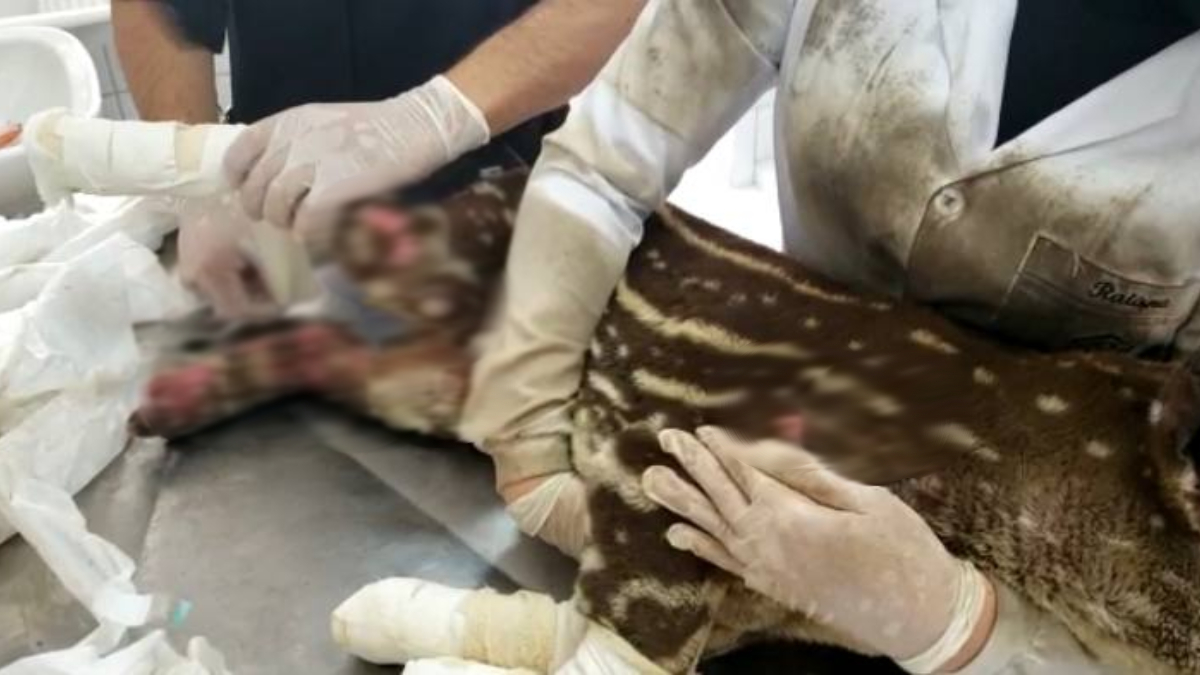 Um filhote de anta, de aproximadamente dois meses de vida, ficou cego e teve 40% do corpo queimado após ser atingido por um incêndio, na região próxima ao Parque Nacional das Emas, no Sudoeste de Goiás. O animal foi resgatado na manhã desta quinta-feira (15), após ser encontrado por um trabalhador em um canavial na região do Morro Vermelho, que fica à 30 quilômetros do Parque. Segundo o professor e biólogo Airton Katsuyama, um dos voluntários que está cuidando do filhote, o animal apresenta ferimentos graves de queimaduras de terceiro grau e tem 20% de chance de sobreviver. “Mas não significa que vamos desistir dele!”, diz.