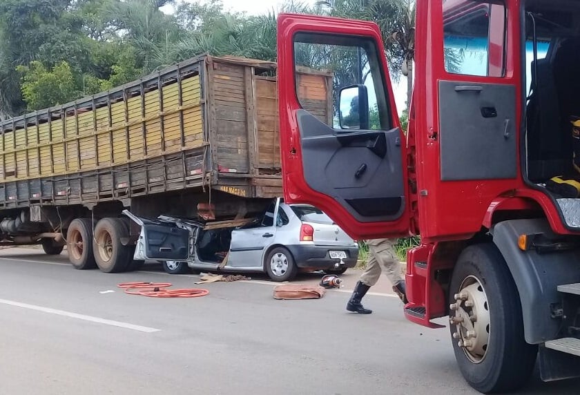 Um homem foi resgatado depois de bater o carro que dirigia na traseira do caminhão modelo gaiola. O fato aconteceu em um trecho que já é município de Inhumas, na GO-070. Bombeiros tiveram que retirar a vítima das ferragens. O carro ficou totalmente destruído, debaixo do caminhão.