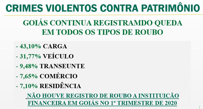 O primeiro trimestre deste ano, ainda conforme o SSP, marcou uma queda considerável nos crimes graves, como homicídio, que teve redução de 20,20%, e latrocínio (roubo seguido de morte), que caiu 54,55%, em relação ao mesmo período de 2019. Roubos de cargas também apresentaram queda de 43,10%, e de veículos caíram 31,77%.
