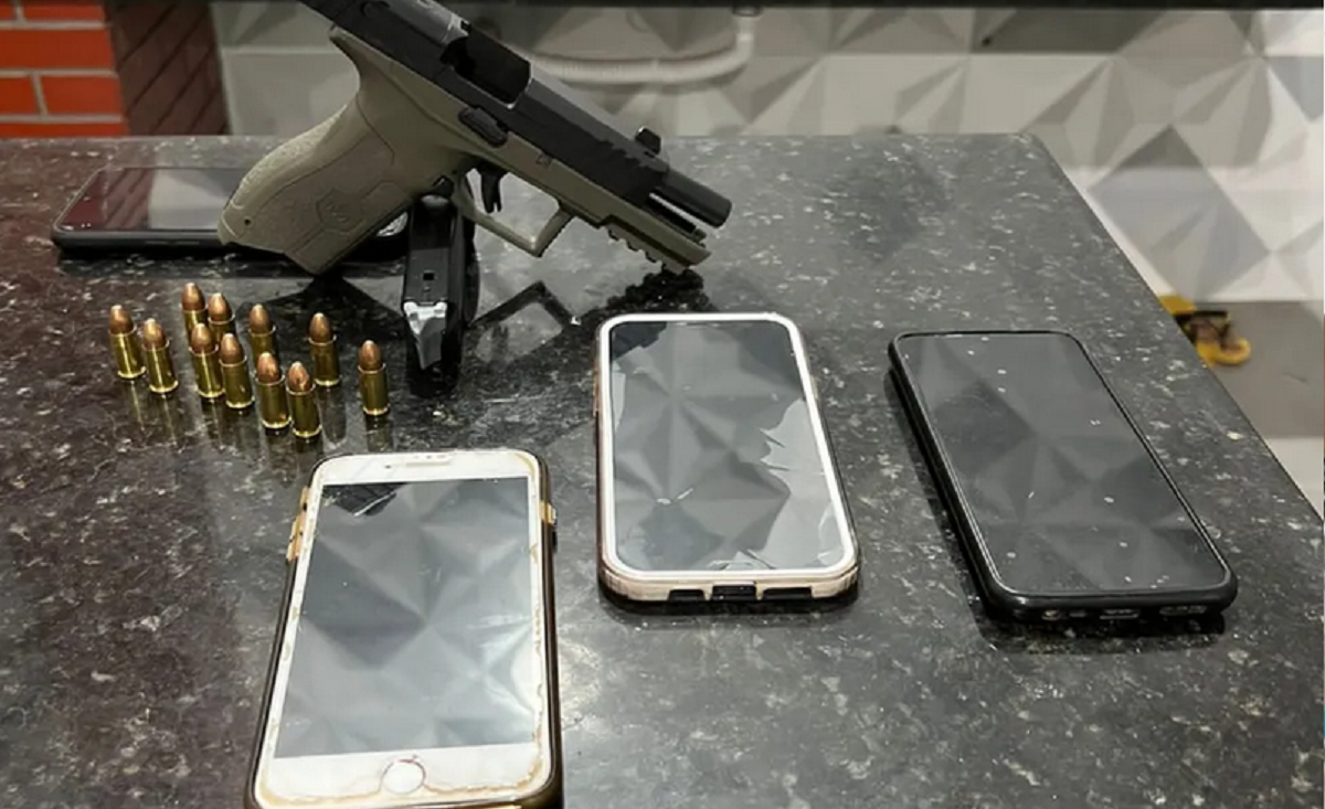 Durante a operação, foram apreendidos veículos de alto valor, folhas de cheque, armas de fogo e porções de drogas.