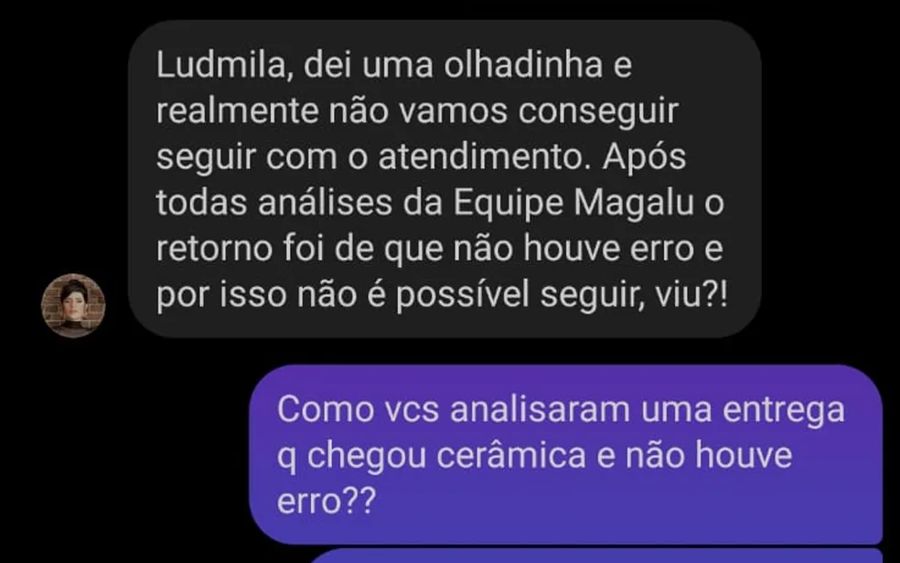 Após entrar em contato com a empresa e pedir suporte, a loja pediu um prazo até 2 de maio para resolver o problema. Uma semana depois, o entregador e a empresa de entrega entraram em contato com a cliente, mas sem sucesso. O entregador chegou a levar um documento de acareação para que a cliente assinasse dizendo que o pacote havia sido entregue, mas Ludmila ponderou que assinou apenas que recebeu a remessa, não o produto.
