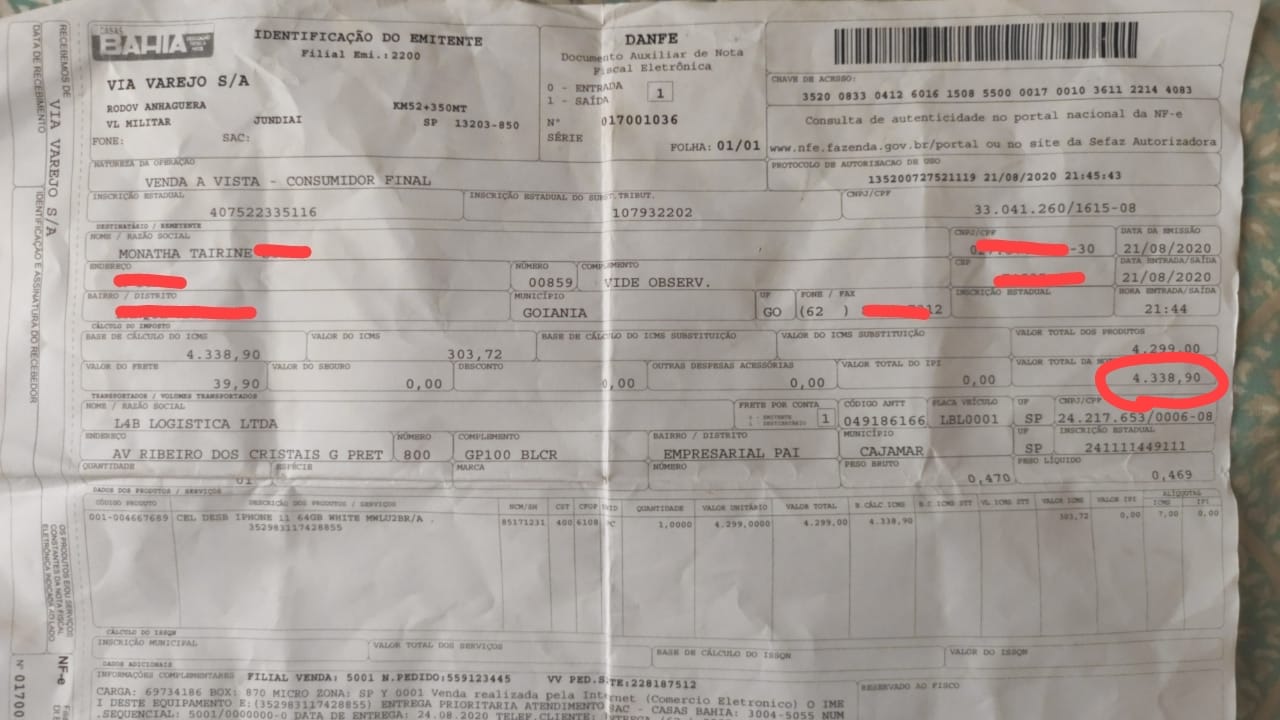 Ao Mais Goiás, Mônatha conta que comprou o iPhone no dia 21 deste mês pelo site oficial da rede de lojas Casas Bahia. A jornalista, que se diz acostumada a comprar pela internet, destaca que se atentou ao site para ter certeza de que estava acessando um local seguro. “Me certifiquei se não eram aquelas lojas que usam sites pra fazer as vendas, digamos, que de forma terceirizada, e não era”, relata.