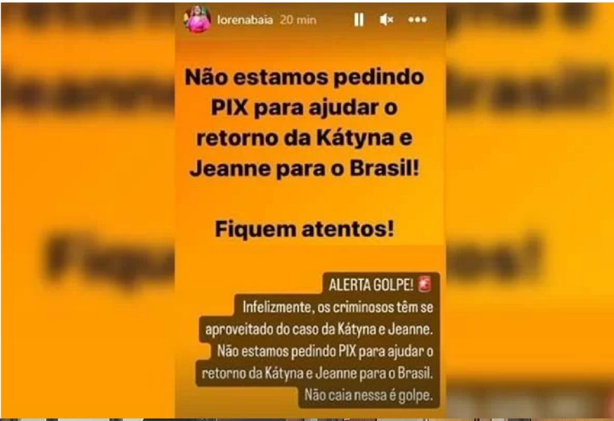 Lorena Baía, irmã de uma das goianas, também fez um alerta nas redes sociais, informando que criminosos estão aplicando golpes no nome delas. “Não estamos pedindo Pix para ajudar no retorno da Kátyna e Jeanne para o Brasil. Fiquem atentos”, publicou.