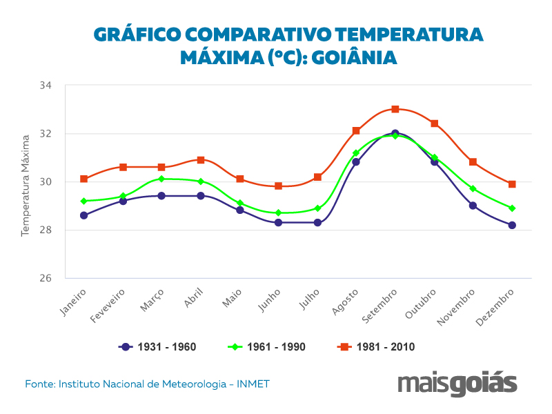 Dados registrados pelo Instituto Nacional de Meteorologia (Inmet) mostram a mencionada evolução. A temperatura máxima registrada entre 1931 e 1960, nos meses de junho, agosto e setembro foi de 28,3°C, 30,8°C e 32°C, respectivamente. Nos mesmos meses, entre 1961 e 1990, os registros foram de de 28,9°C, 31,2°C e 31,9°C. Já entre 1991 e 2010, ocorreu evolução ainda maior: 30,2°C, 32,1°C e 33°C, também nos meses de julho, agosto e setembro.
