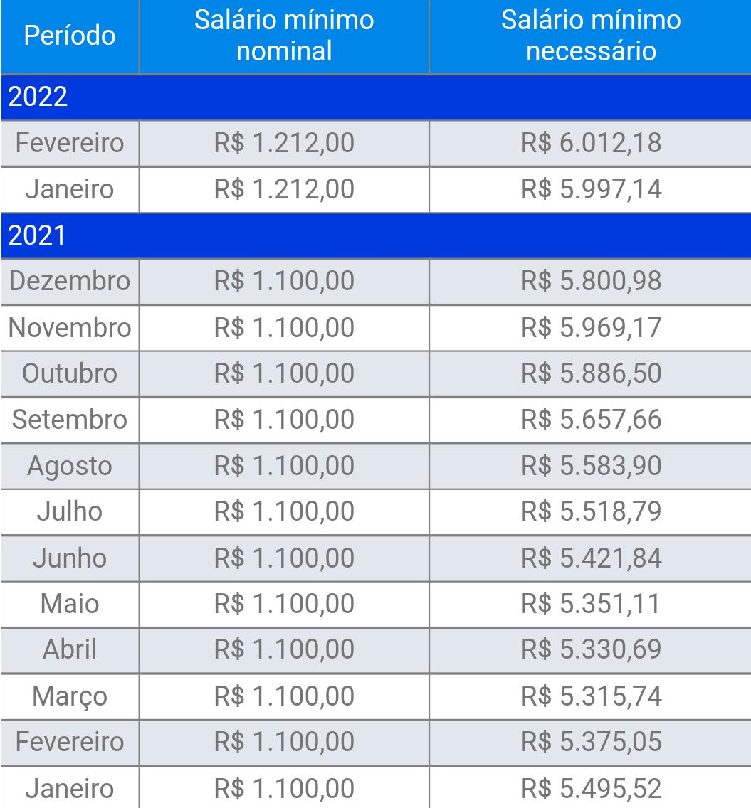 O valor estipulado é cerca de 4,96 vezes maior que o atual, que está em R$ 1.212. Em fevereiro de 2021, o valor estipulado do salário mínimo necessário era R$ 5.375,05, ou seja, 4,89 vezes maior que o vigente na época, de R$ 1.100.