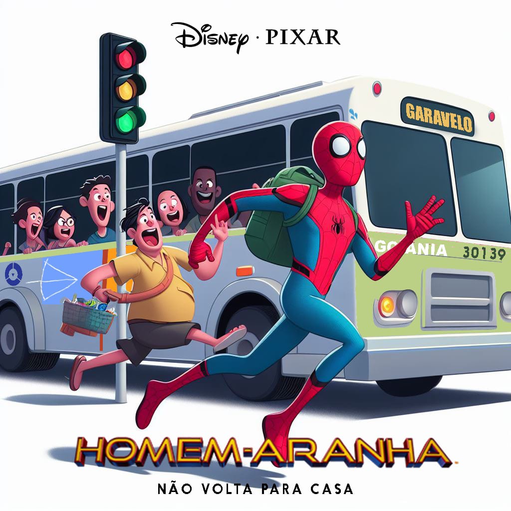 Como seria o “Homem Aranha: de volta para casa” se ele tivesse sido rodado em Goiânia? O criador das artes sugere que ele não conseguiria voltar para casa em razão dos ônibus cheios.