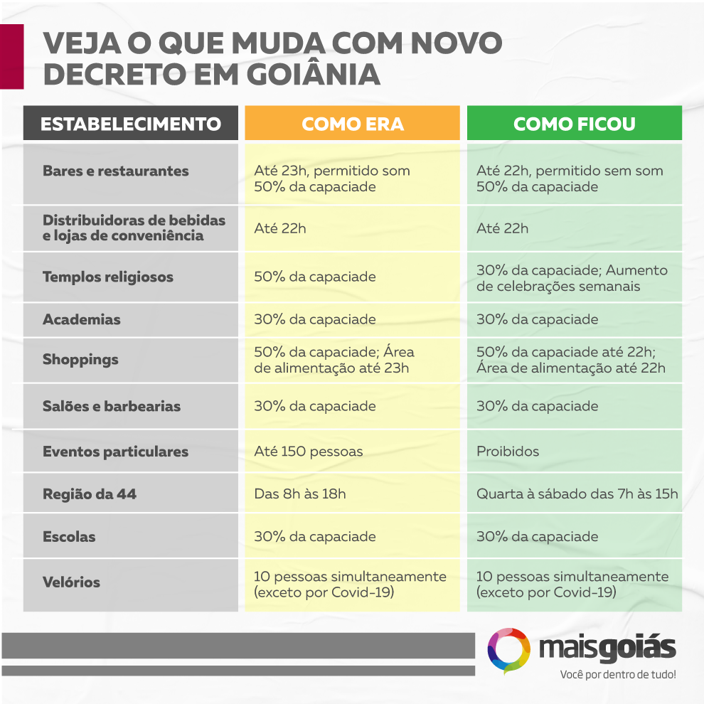 A prefeitura de Goiânia publicou, na última segunda-feira (22), um novo decreto para conter o avanço da covid-19 na capital. O documento número 1.601 traz medidas mais restritivas para o comércio da cidade. A maior mudança é o funcionamento das lojas na Região da 44, que agora passam a funcionar de quarta a sábado e das 7h às 15h. Bares, restaurantes, distribuidoras e afins também sofreram mais uma restrição: vão ter que fechar às 22h.