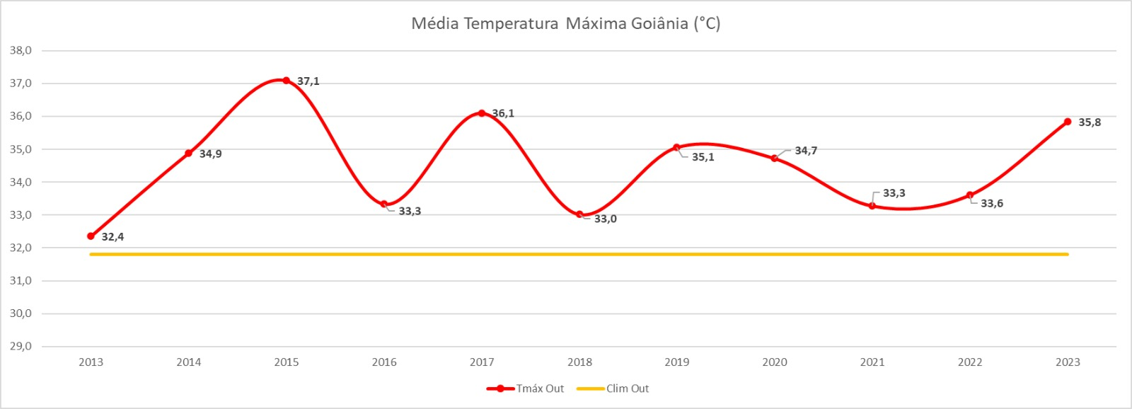 Em relação a temperatura, outubro de 2023 teve média máxima, em Goiânia, de 35,8ºC. Foi o terceiro mês de outubro mais quente desde 2013. O maior calor dos últimos dez anos foi em 2015, com média máxima de 37,1ºC. Em segundo lugar, 2017, com 36,1ºC.