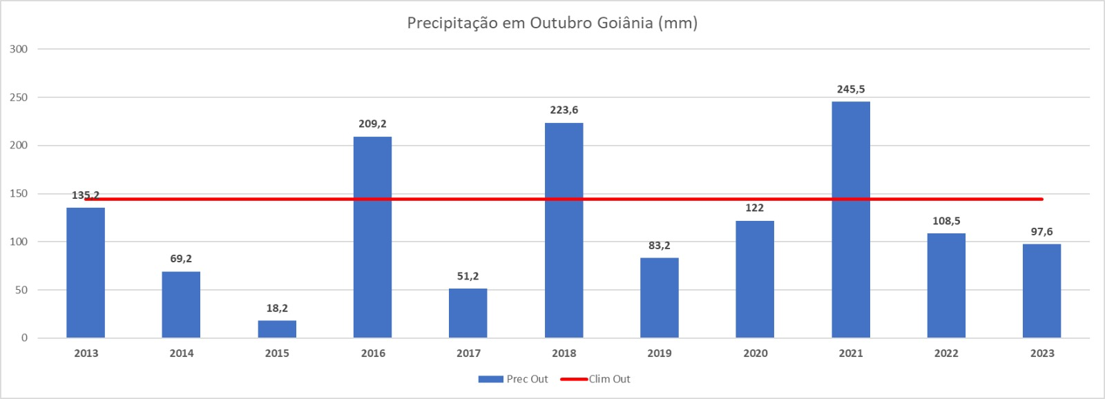 Desde 2013, o décimo mês com menos chuvas foi em 2015, com somente 18,2 milímetros. Já o outubro mais chuvoso foi em 2021, com 245,5 milímetros.