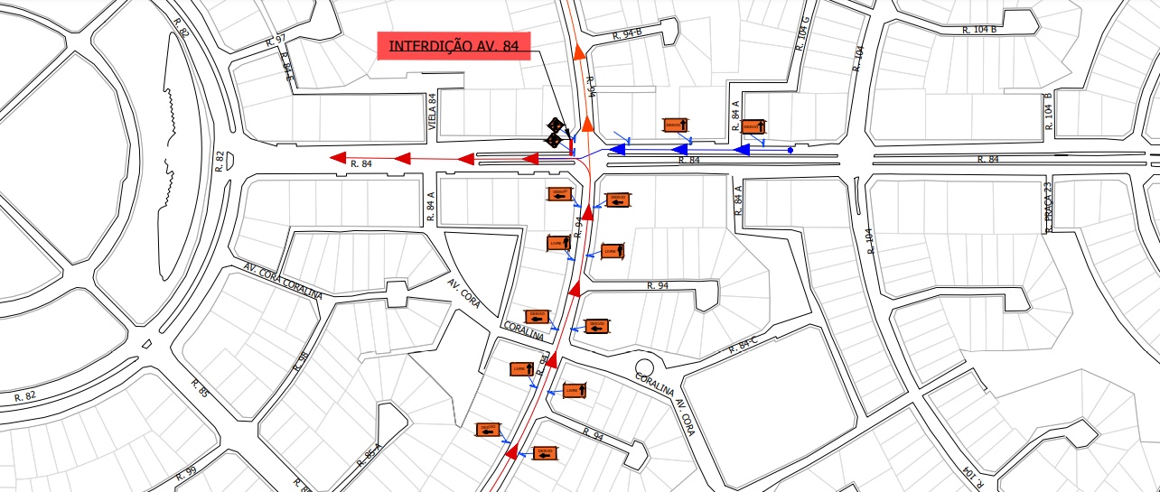 Ainda segundo a SMM, a interdição ocorre em apenas um trecho da Rua 84, próximo à Praça Cívica. Assim, quem estiver transitando pela mencionada via poderá utilizar meia pista para circular no local. Há, ainda, a opção de desvio pela Rua 94 (veja abaixo).