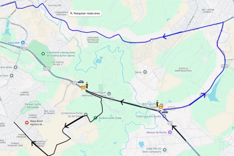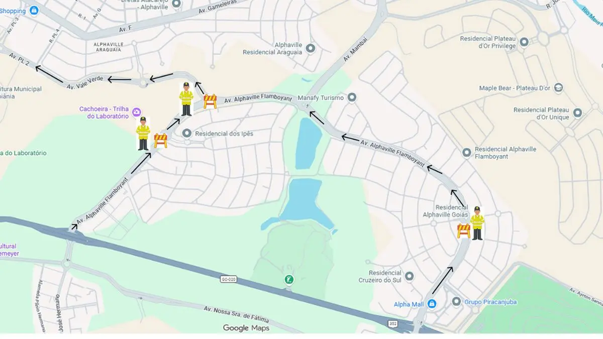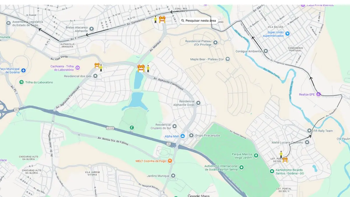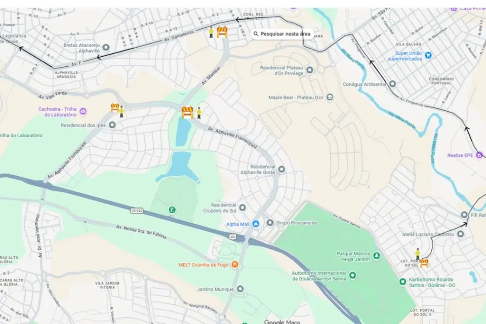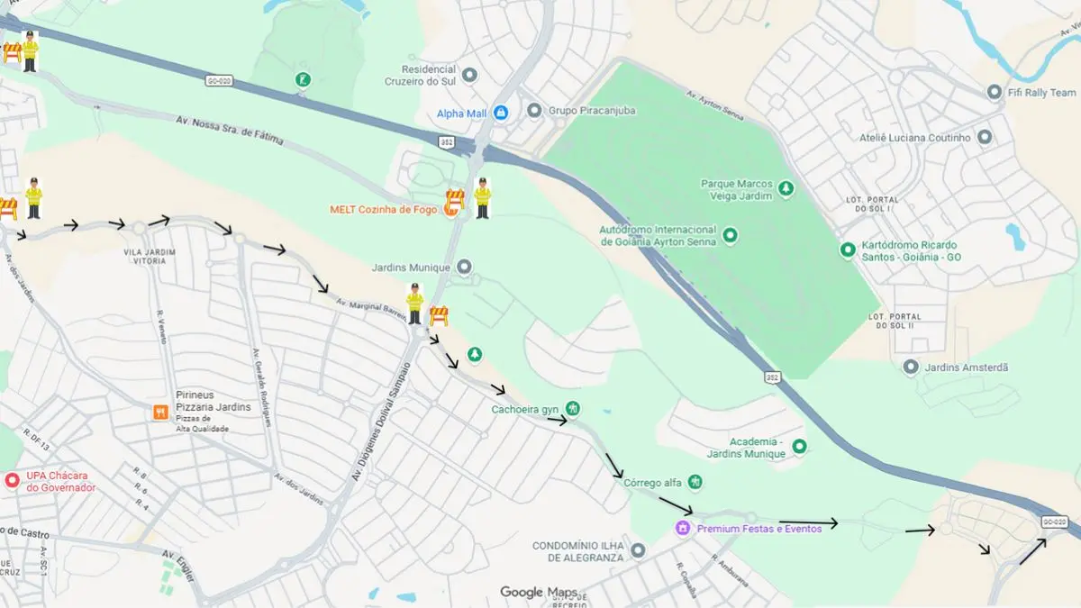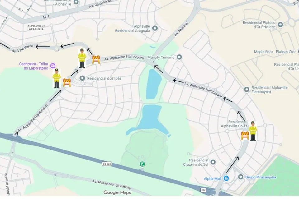 Outro ponto de alteração será na região do Alpha Mall e do Porsche Center. Nesse caso, os motoristas deverão utilizar a Avenida Alphaville Flamboyant, seguir pela Avenida Vale Verde e depois acessar a Avenida PL-2. O percurso continua pela Avenida Emival Bueno, que servirá como rota alternativa durante o período de mudanças no trânsito. Veja: