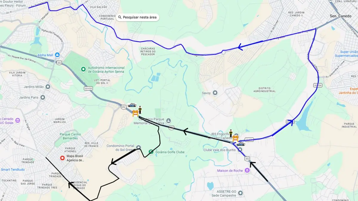Para quem trafega no sentido Bela Vista em direção a Goiânia, duas opções de desvio foram definidas. A primeira alternativa passa pela GO-020, no sentido da capital, com acesso nas proximidades da JBS em direção a Senador Canedo. Em seguida, o motorista deve seguir pela Alameda Perimetral Norte, acessar a Avenida Joaquim Nicolau e depois continuar pela Avenida Gameleira.