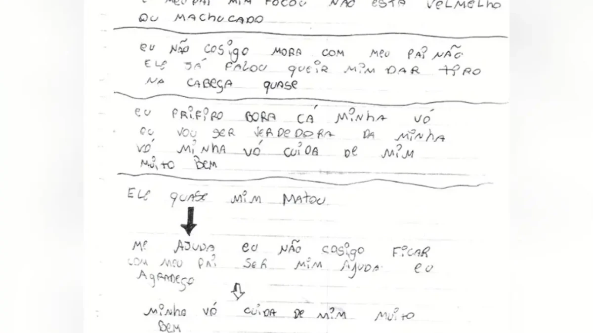 No texto, a adolescente descreve agressões como enforcamento e lesões pelo corpo, além de relatar que foi ameaçada com uma arma de fogo. Em um dos trechos, ela afirma estar com o braço “roxo” e “vermelho” e que o homem quase deu um tiro em sua cabeça. Na carta, ela afirma que preferia morar a com a vó, pede ajuda e afirma que o pai quase a matou.