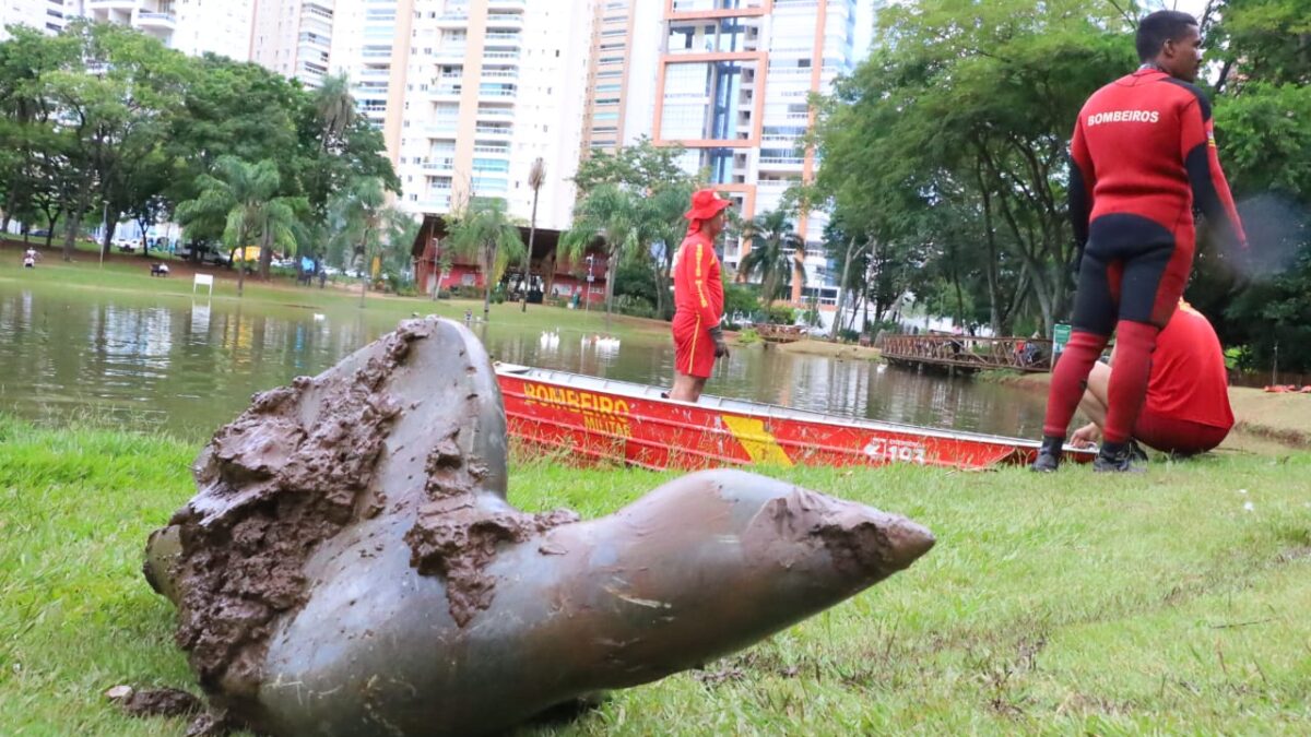 Força-tarefa encontra escultura submersa em lago do Parque Flamboyant