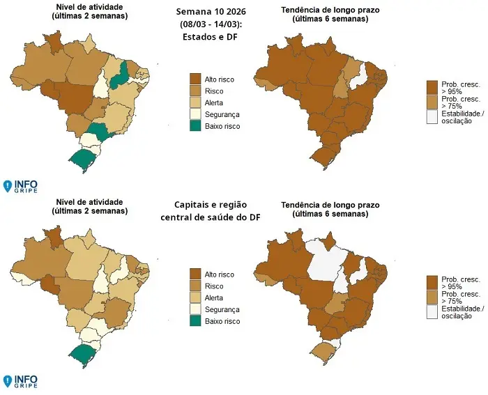 Os dados fazem parte do Boletim InfoGripe, referente à Semana Epidemiológica 10, entre os dias 8 e 14 de março. O monitoramento indica que a influenza A tem avançado em todo o país e contribuído diretamente para o aumento dos casos de SRAG, pressionando os sistemas de saúde antes mesmo do início oficial do outono, que começou no último dia 20.