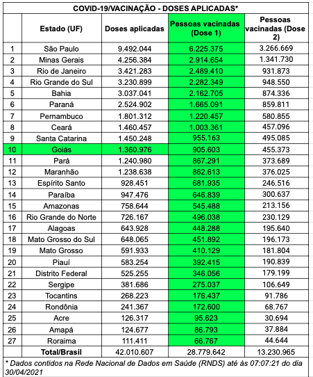 Em Goiás, são 1,36 milhão de doses aplicadas, das quais 905 mil foram 1ª dose e 455 mil segunda dose. À frente dos goianos estão, por ordem crescente, Santa Catarina (1,45 milhão de doses aplicadas), Ceará (1,46 milhão), Pernambuco (1,8 milhão), Paraná (2,52 milhões), Bahia (3,03 milhões), Rio Grande do Sul (3,23 milhões), Rio de Janeiro (3,42 milhões), Minas Gerais (4,25 milhões) e São Paulo (9,49 milhões).