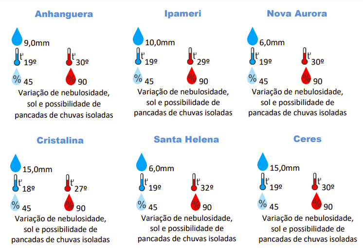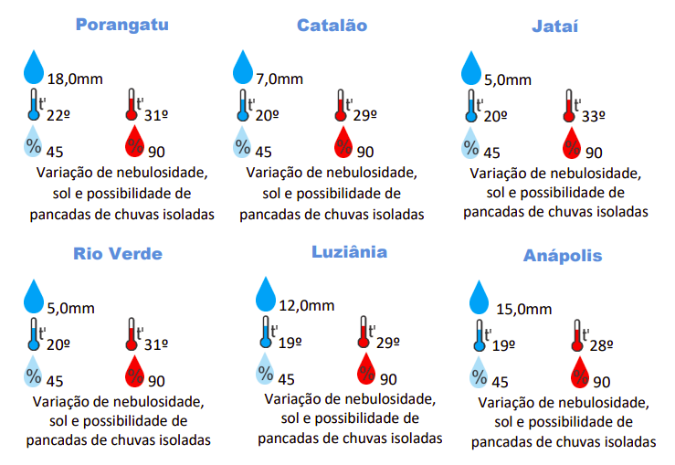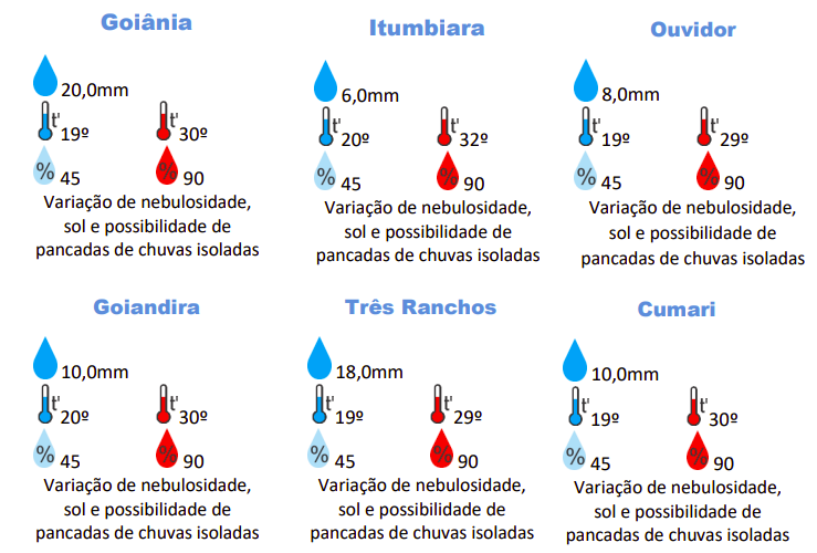 As regiões Leste, Sudoeste e Central de Goiás são as que enfrentarão as menores temperaturas, com mínimas de 18ºC e 19ºC, respectivamente. Já nas regiões Oeste, Norte e também Sudoeste, o calor pode checar a marcar aos 33ºC.