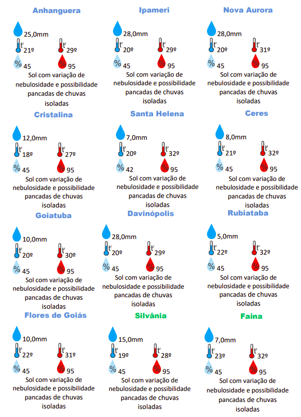 Em Goiânia, por exemplo, haverá sol e variação de nebulosidade com possibilidade de pancadas de chuvas isoladas. A temperatura máxima de hoje pode chegar aos 32ºC, na capital. Já a umidade relativa do ar varia entre 40% a 95%.