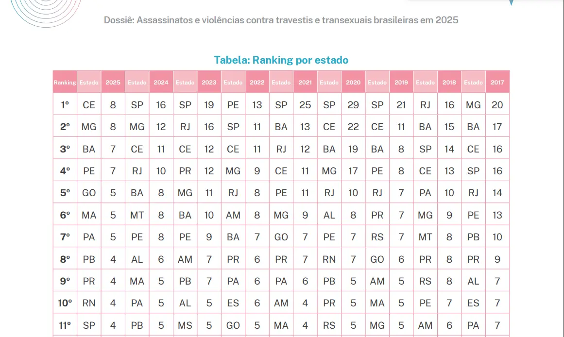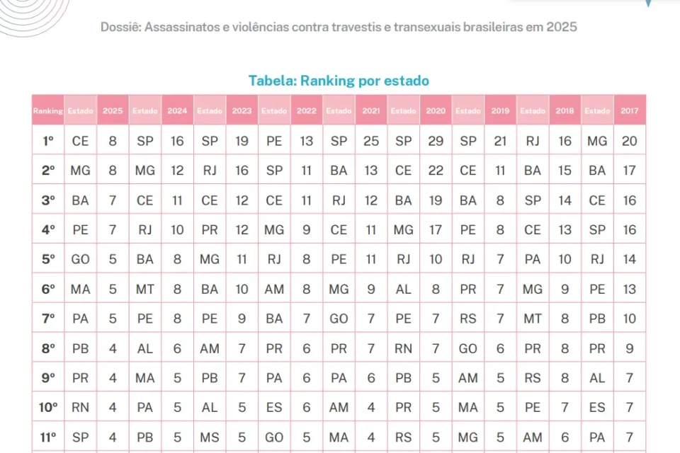 Goiás está entre os estados mais violentos do país para pessoas trans no Brasil, que, por sua vez, lidera o ranking global de assassinatos transfóbicos. Ao longo de 2025, foram registrados cinco óbitos em território goiano, número que coloca a unidade federativa na quinta posição do ranking nacional. Na liderança do ranking aparecem Ceará e Minas Gerais, com 8 casos cada um. Eles são seguidos por Bahia e Pernambuco, que somam 7. Logo abaixo da posição onde Goiás está inserido estão Paraíba, Rio Grande do Norte, Paraná e São Paulo, com quatro assassinatos cada (veja a tabela abaixo).