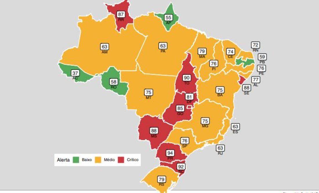 Além de Goiás, o boletim destaca que outras quatro unidades federativas estão com a taxa de ocupação de UTIs de Covid-19 entre 80% e 89%. São elas: Roraina (87%), Mato Grosso do Sul (88%), Sergipe (88%) e Distrito Federal (81%).