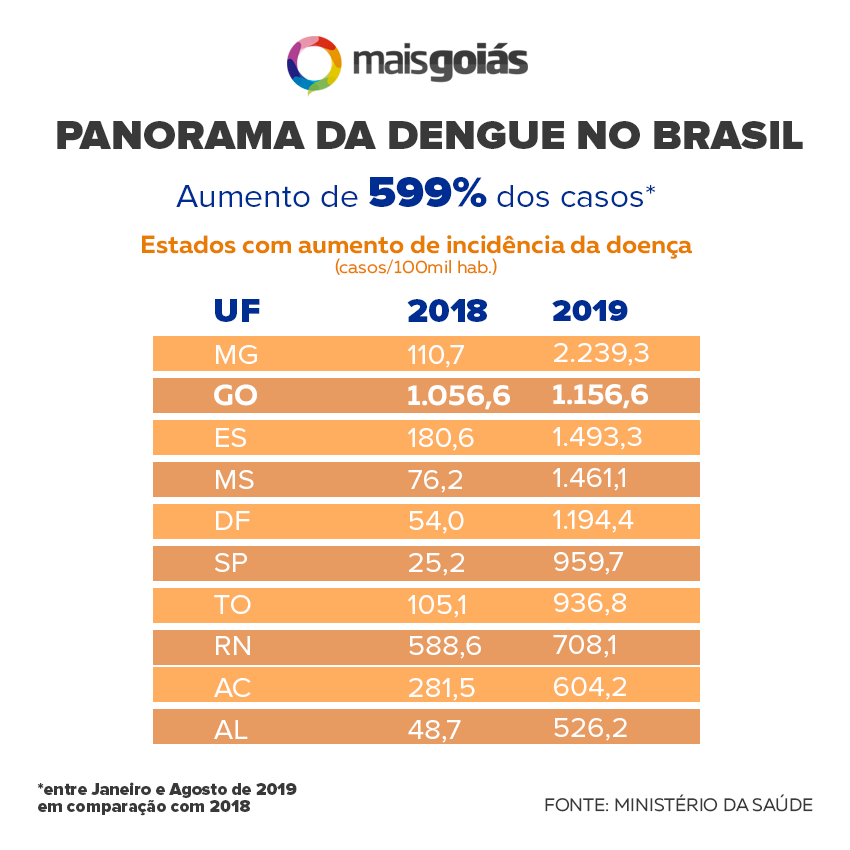 O Ministério da Saúde (MS) lançou a campanha nacional de combate ao Aedes Aegypti “Combata o Mosquito”, na manhã desta quinta-feira (12). Segundo dados do ranking nacional de incidência de dengue, o Estado de Goiás ocupa o segundo lugar do levantamento. São mais de 1,5 mil novos casos registrados, 9.4% a mais que em 2018 (1.056). O estado goiano ficou atrás apenas de Minas Gerais, que teve 2,2 mil novos casos.