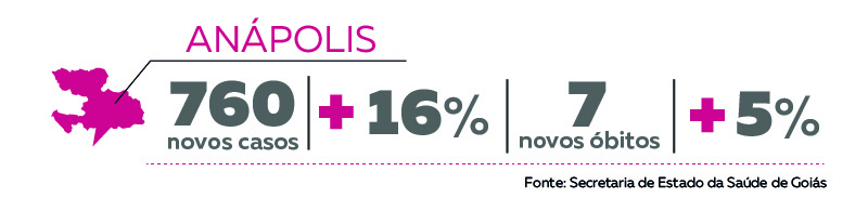 Entre as três maiores cidades do estado, Anápolis registrou o maior aumento. O número de casos de coronavírus saiu de 4.512 para 5.272, um crescimento de 16,8% no período. O percentual está acima da média estadual, mas é menor do que o notado no período anterior (23,1%).