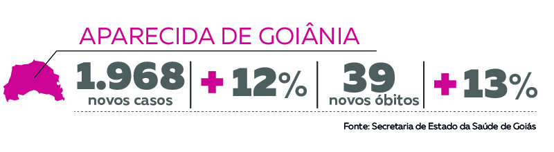 Em Aparecida de Goiânia foram confirmados 1.968 novos casos da doença em uma semana, um crescimento de 12,1%. O total de casos agora é de 18.170. Foram registrados também 39 novos óbitos no município, um crescimento de 13%.