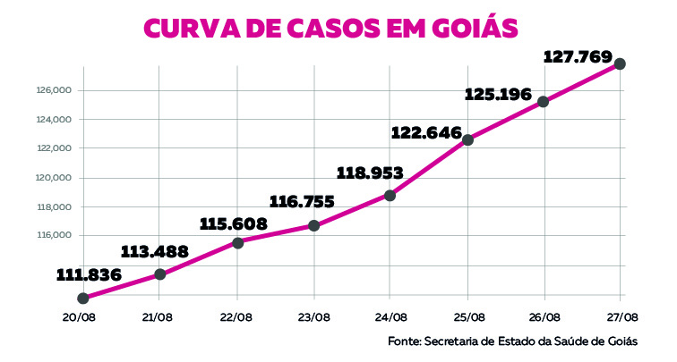 O estado de Goiás registrou 15.933 casos de coronavírus em uma semana, de acordo com os dados fornecidos pela Secretaria de Estado de Saúde (SES)*. Nesta quinta-feira (27), foram registradas 127.769 confirmações, contra 111.836 do dia 20 de agosto. O aumento no período foi de 14,2%.