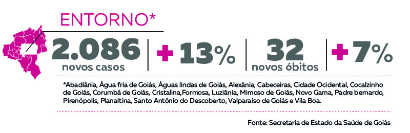 A região do Entorno de Brasília apresentou um percentual de crescimento abaixo da média estadual. Em uma semana, o número de casos de coronavírus saiu de 15.515 para 17.601, o que representa um aumento de 13,4%. O percentual apurado é maior do que o registrado na semana anterior, de 12,6%. Foram confirmadas também 32 mortes na semana, um crescimento de 7,5%.