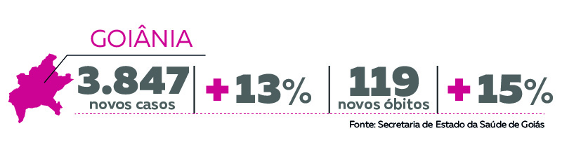 Em Goiânia foram confirmados 3.847 novos casos em uma semana, o que representa um aumento de 13,6%. Na semana anterior, o crescimento foi de 15,6%. O número de mortes na cidade saiu de 752 para 871, um acréscimo de 15,8%. O aumento foi maior do que na semana passada (15,6%).