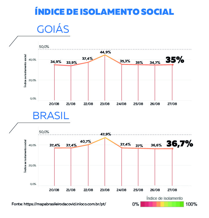 O índice de isolamento social em Goiás manteve-se praticamente o mesmo nesta semana, saindo de 34,9% para 35% de acordo com o monitoramento da empresa de georreferenciamento In Loco. O estado possui o pior índice de isolamento social do país. A média nacional é de 43,7% e o recomendado pelas autoridades de saúde é de 70%.