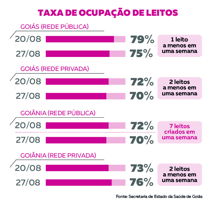 Em Goiânia, a taxa de ocupação saiu de 72,6% no dia 20 para a 70,5% nesta quinta, de acordo com a Secretaria Municipal de Saúde (SMS). Os dados da pasta mostram também que 7 novos leitos foram disponibilizados para pacientes com o coronavírus. O total agora é de 237.