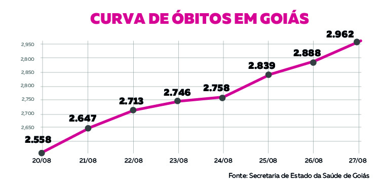 Os dados também mostram que tanto o número de casos quanto o de óbitos continuam crescendo acima da média nacional. Em todo o país, o número de casos confirmados de coronavírus subiu 7,4% no período, chegando a 3.761.391 infectados, de acordo com o Ministério da Saúde (MS). Já o número de vítimas fatais aumentou 6,5% e chegou a 112.304. Entretanto, a taxa de letalidade no estado de Goiás (2,3%) é menor do que a média brasileira (3,2%).