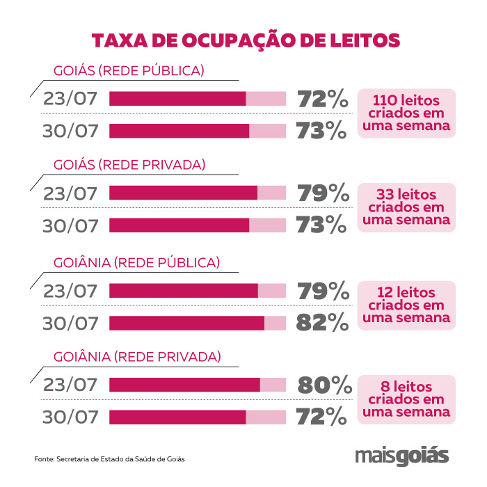 A taxa de ocupação dos leitos destinados ao tratamento de Covid-19 em Goiás aumentou na rede pública e diminuiu na rede privada. De acordo com dados da SES, no dia 16 de julho o estado de Goiás contava estava com 72,6% dos 694 leitos ocupados. Este percentual subiu para 73,8% nesta quinta (30). Além disso, foram implantados 110 leitos no período, contra 11 da semana anterior.