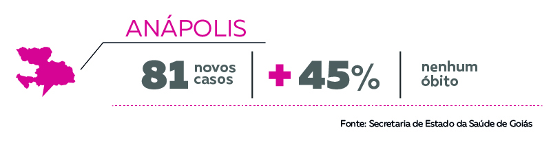 Já em Anápolis o crescimento foi maior do que o registrado nos períodos anteriores. O número de casos saiu de 179 para 260, um aumento de 45,25%. No período anterior, o crescimento havia sido de 35,60%. Entre os dias 21 e 28 de junho, o percentual foi de 20%. Foi registrado um óbito no município e o total de mortes agora é de 3.