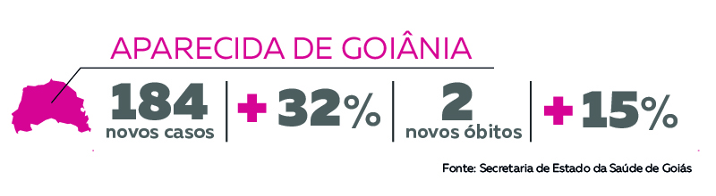 Em Aparecida de Goiânia o número de casos saiu de 573 para 757, um crescimento de 32,11% no período. Proporcionalmente, o aumento foi menor do que no período anterior, quando o acréscimo foi de 67,54%. No período ocorreram dois novos óbitos e o total agora é de 15 vítimas fatais na cidade.