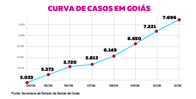 O estado de Goiás registrou 2.673 casos de coronavírus em uma semana, de acordo com os dados fornecidos pela Secretaria de Estado de Saúde (SES)*. Na quinta-feira (11), foram registradas 7.696 confirmações, contra 5.023 do dia 4 de junho. O aumento no período foi de 53,21%.