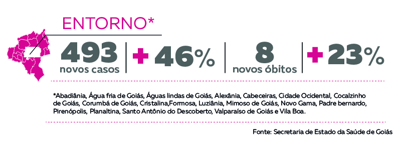 A região do Entorno de Brasília apresentou um percentual de crescimento abaixo da média estadual. Em uma semana, o número de casos saiu de 1.050 para 1.543, o que representa um aumento de 46,95% no período. Houve uma forte queda no número de casos, uma vez que o índice registrado na semana anterior foi de 180%. Houveram ainda oito mortes no período, um crescimento de 23,52%.