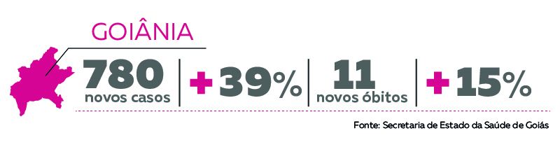 Em Goiânia foram registrados 780 novos casos nos dias analisados, um crescimento de 39,31%. Esse aumento está abaixo da média estadual, mas é maior do que o atingido na semana passada (34,69%).