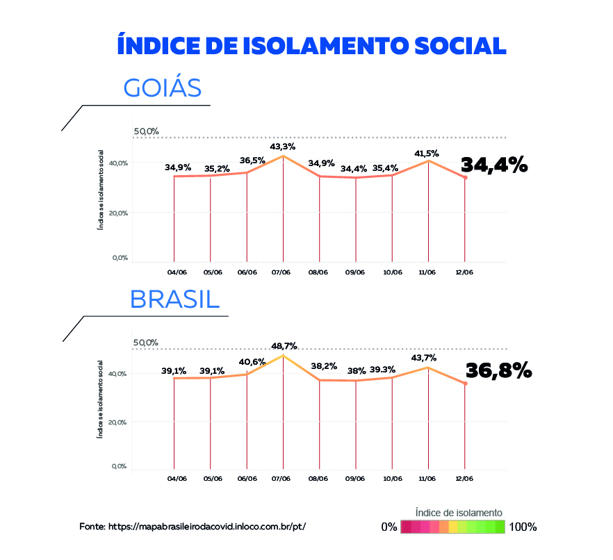 O índice de isolamento social em Goiás aumentou nessa semana, saindo de 34,9% para 41,5%, de acordo com o monitoramento da empresa de georreferenciamento In Loco. Apesar disso, o estado tem um dos piores índices do país, perdendo apenas para o Maranhão (40,63%) e o Tocantins (39,20%). A média nacional é de 43,7% e o recomendado pelas autoridades de saúde é de 70%.