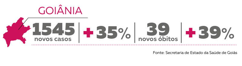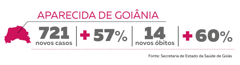 Entre as três maiores cidades do estado, Aparecida de Goiânia registrou o maior aumento. O número de casos saiu de 1.252 para 1.973, um crescimento de 57,58% no período. Proporcionalmente, a alta foi menor do que a notada no período anterior, quando o acréscimo foi de 65,38%. No período, ocorreram 14 novos óbitos e o total agora é de 37 vítimas fatais na cidade.