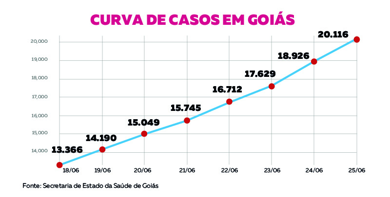 O estado de Goiás registrou 6.750 casos de coronavírus em uma semana, de acordo com os dados fornecidos pela Secretaria de Estado de Saúde (SES)*. Nesta quinta-feira (25), foram registradas 20.116 confirmações, contra 13.366 do dia 18 de junho. O aumento no período foi de 50,50%.