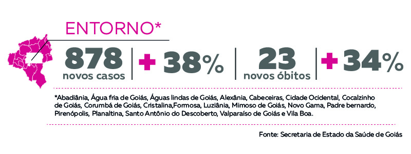 A região do Entorno de Brasília apresentou um percentual de crescimento abaixo da média estadual. Em uma semana, o número de casos saiu de 2.302 para 3.180, o que representa um aumento de 38,14%. A quantia é menor do que a registrada na semana anterior, de 49,18% no período. Foram confirmadas também 23 mortes na semana, um crescimento de 34,32%.