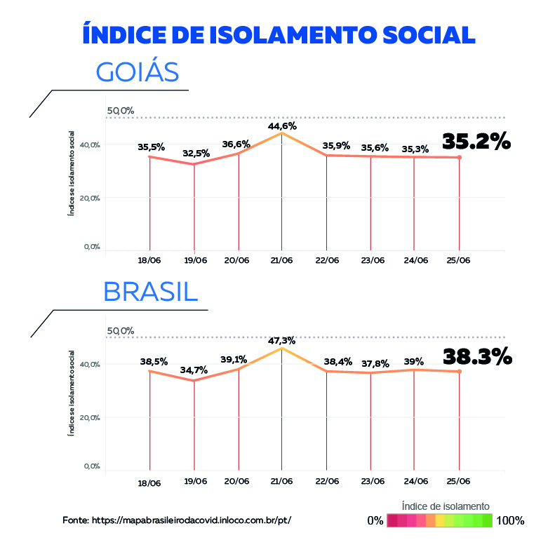 O índice de isolamento social em Goiás voltou a diminuir nessa semana, saindo de 35,5% para 35,2%, de acordo com o monitoramento da empresa de georreferenciamento In Loco. O estado possui o segundo pior índice de isolamento social do país, perdendo apenas para o estado do Tocantins: 33,6%. A média nacional é de 38,3% e o recomendado pelas autoridades de saúde é de 70%.