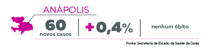Em Anápolis, o número de casos de coronavírus na cidade saiu de 13.861 para 13.921, um crescimento de 0,4% no período. O percentual é menor do que o que foi notado no período anterior (2,7%). Não foram registrados novos óbitos na cidade e o total permanece em 366 vítimas fatais. Na semana anterior o crescimento foi de 2,2%.