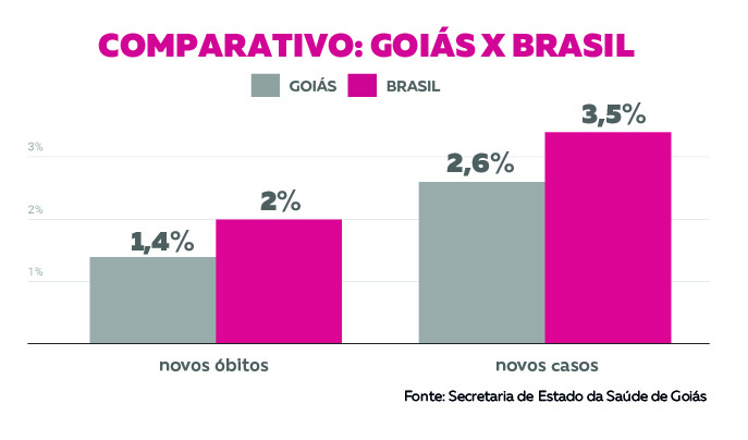 Os dados também mostram que o número de óbitos passou a crescer proporcionalmente abaixo da média nacional. Em todo o País, o número de mortes confirmadas pelo coronavírus subiu 2% no período, chegando a 164.281 mortes, de acordo com o Ministério da Saúde. Já o número de casos confirmados aumentou 3,4% e chegou a 5.781.582. A taxa de letalidade no estado de Goiás (2,2%) é menor do que a média brasileira (2,8%).