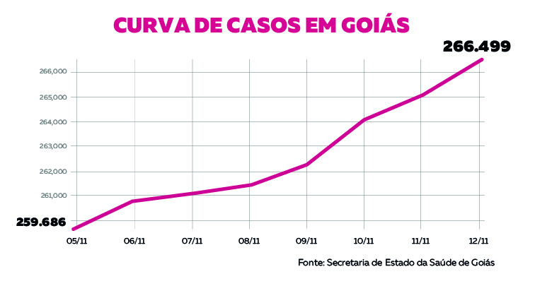 O estado de Goiás registrou 6.813 casos de coronavírus em uma semana, de acordo com os dados fornecidos pela Secretaria de Estado de Saúde (SES)*. Nesta quinta-feira (12), foram registradas 266.499 confirmações, contra 259.686 do dia 29 de outubro. O aumento no período foi de 2,6%.
